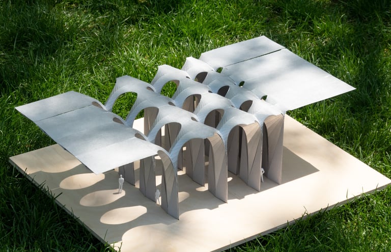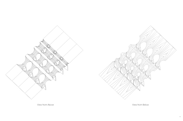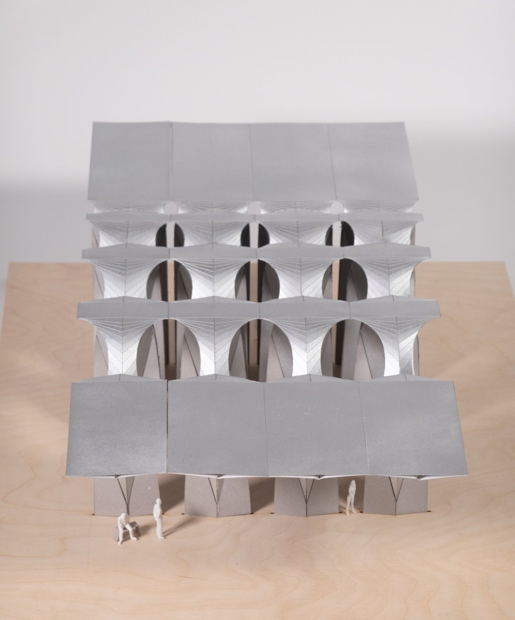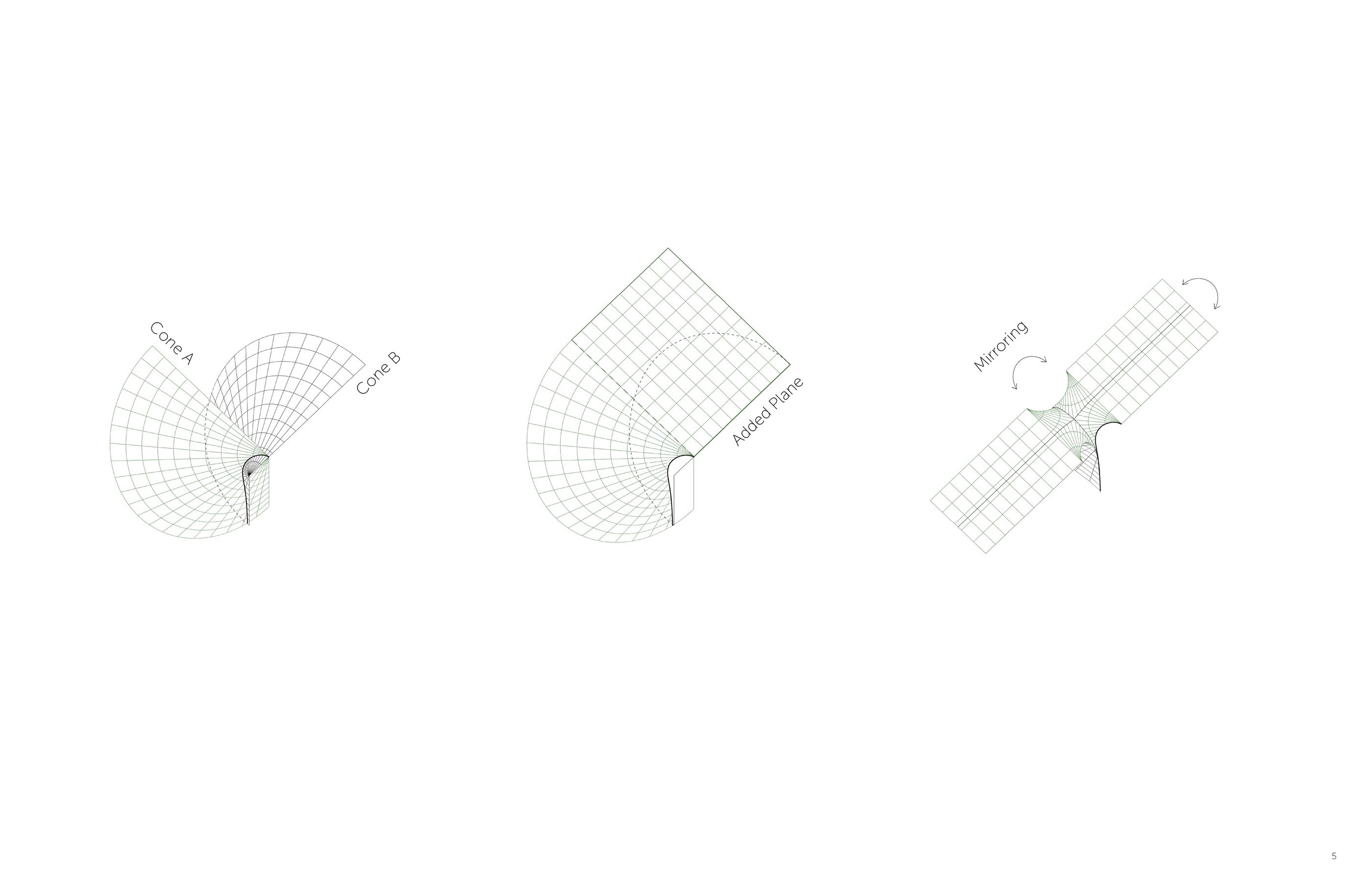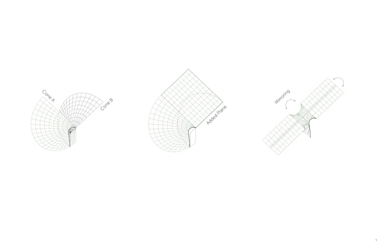This project explores the use of convergence as a technique for manipulating developable surfaces. By intersecting two 90-degree cones, a sinuous curve is generated that extends infinitely and becomes the profile for skylight openings. By mirroring and intersecting the unit at different distances, fragments of the infinite curve are extracted, creating spatial variations in different scales.