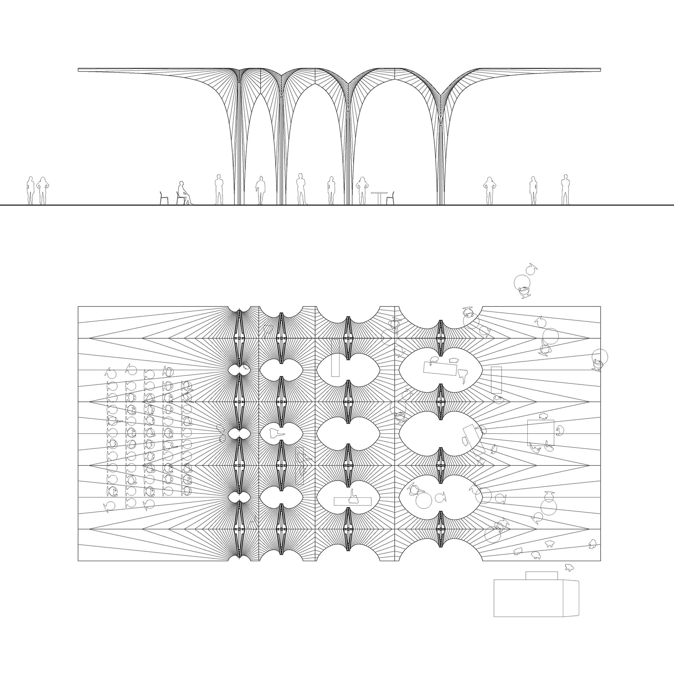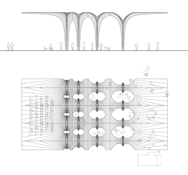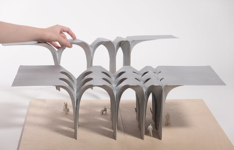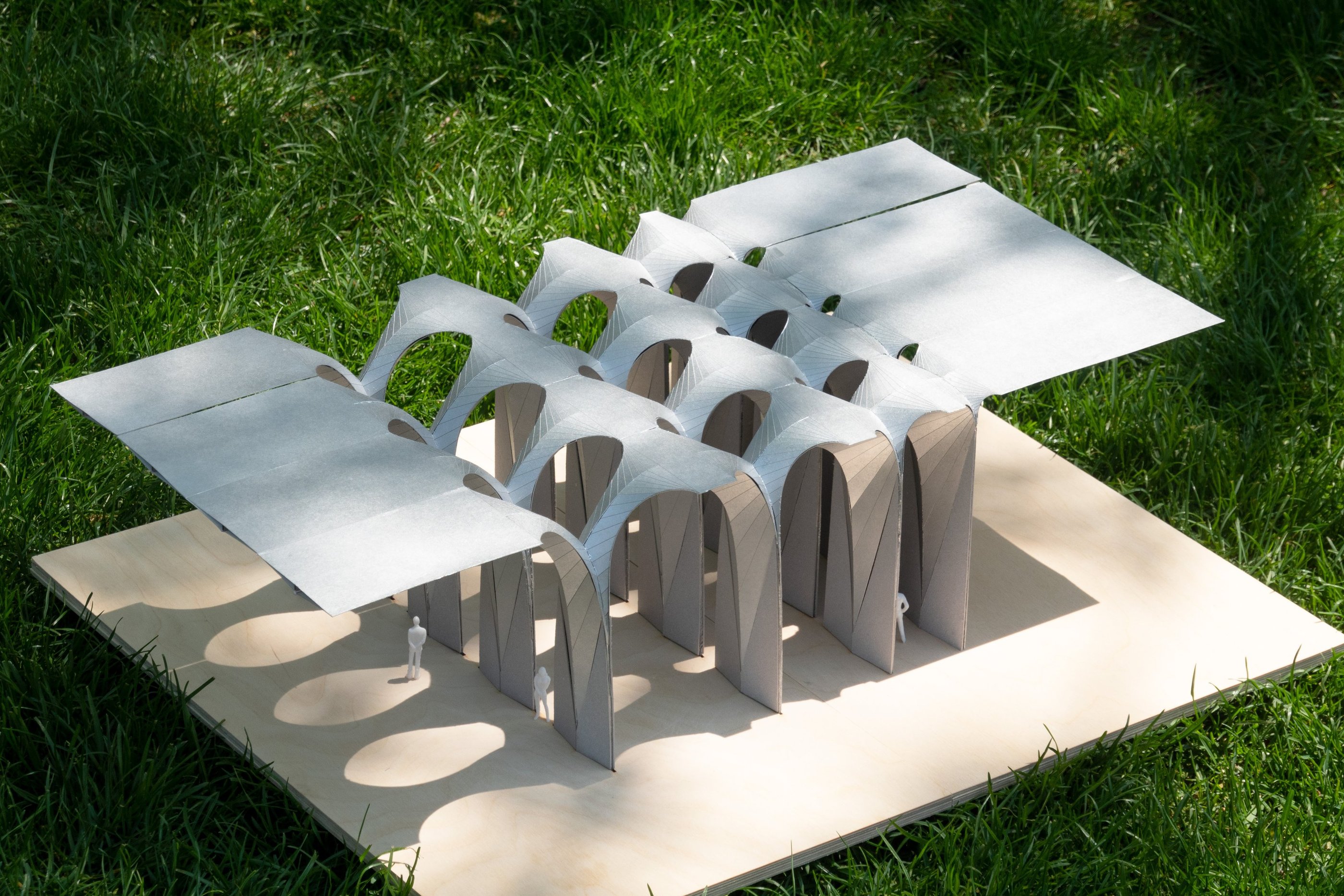 This project explores the use of convergence as a technique for manipulating developable surfaces. By intersecting two 90-degree cones, a sinuous curve is generated that extends infinitely and becomes the profile for skylight openings. By mirroring and intersecting the unit at different distances, fragments of the infinite curve are extracted, creating spatial variations in different scales.