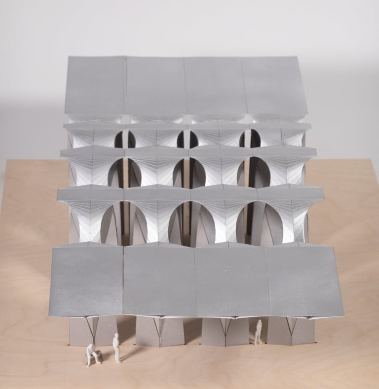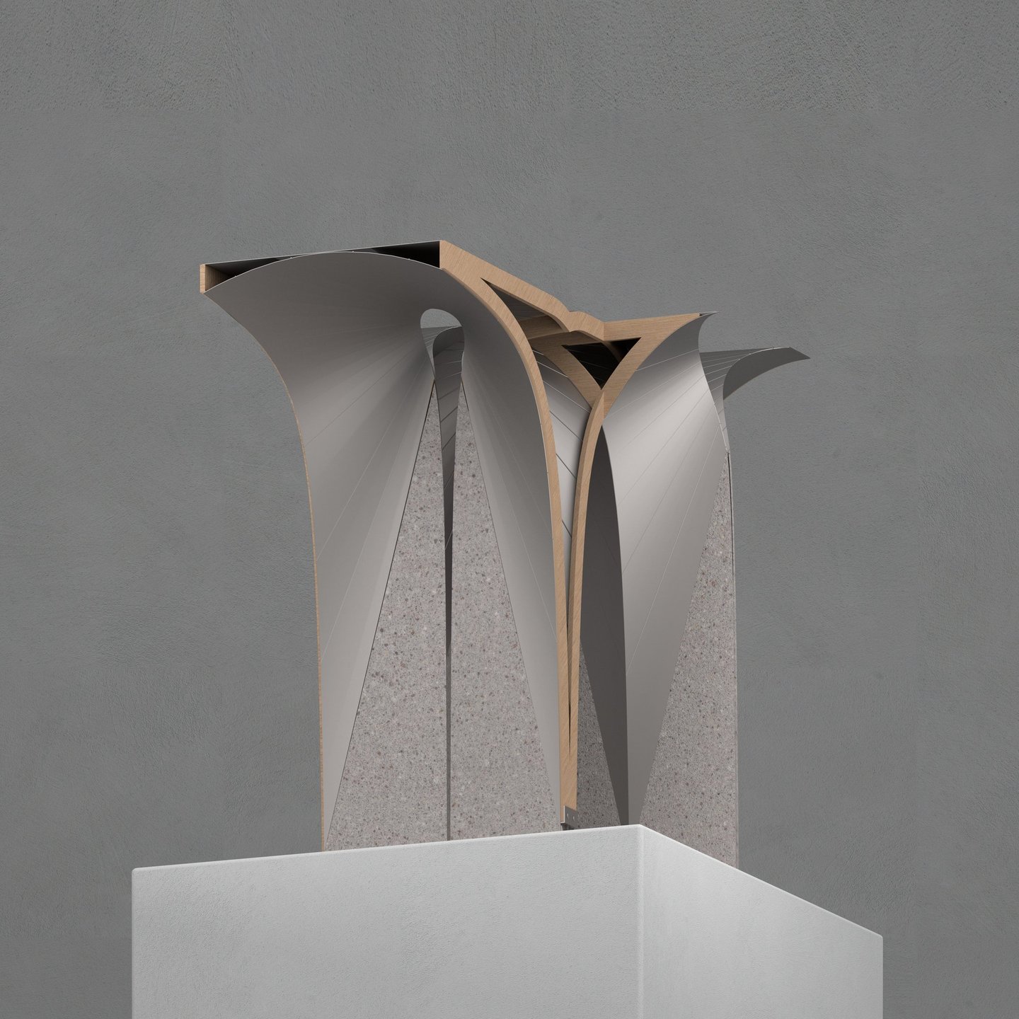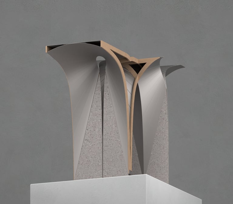 To anchor the structure to the ground, the material transitions to stone near the bottom of the unit, where the ideal geometry becomes infinitely narrow. This connection to the ground provides stability and a sense of grounding to the structure.