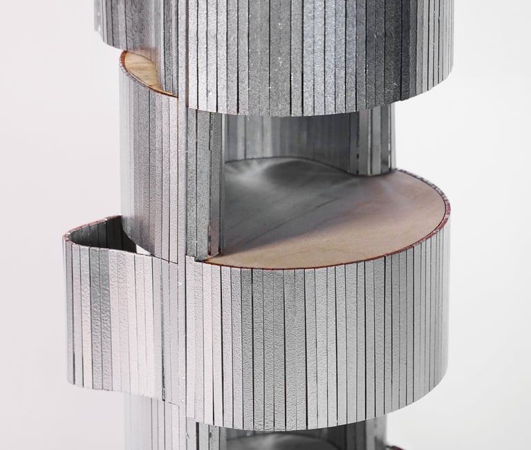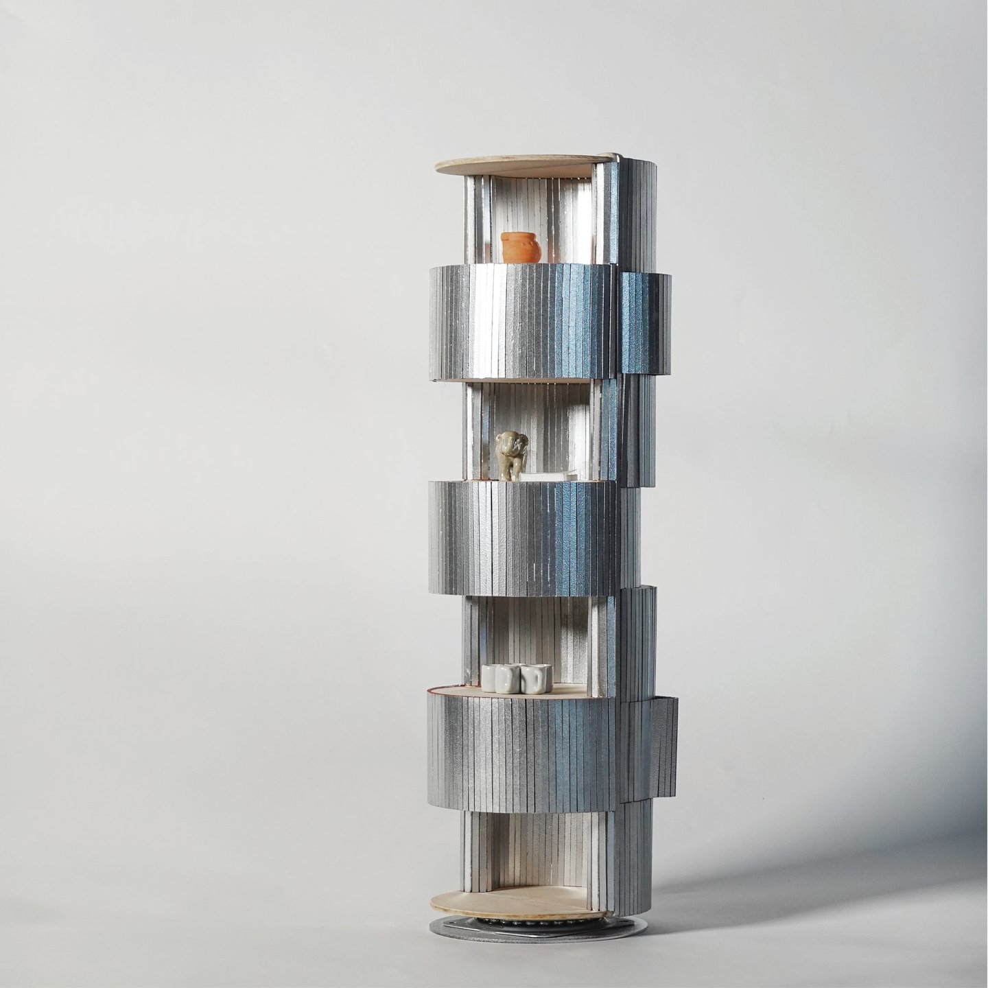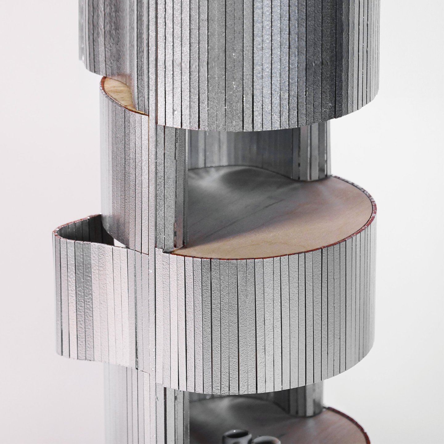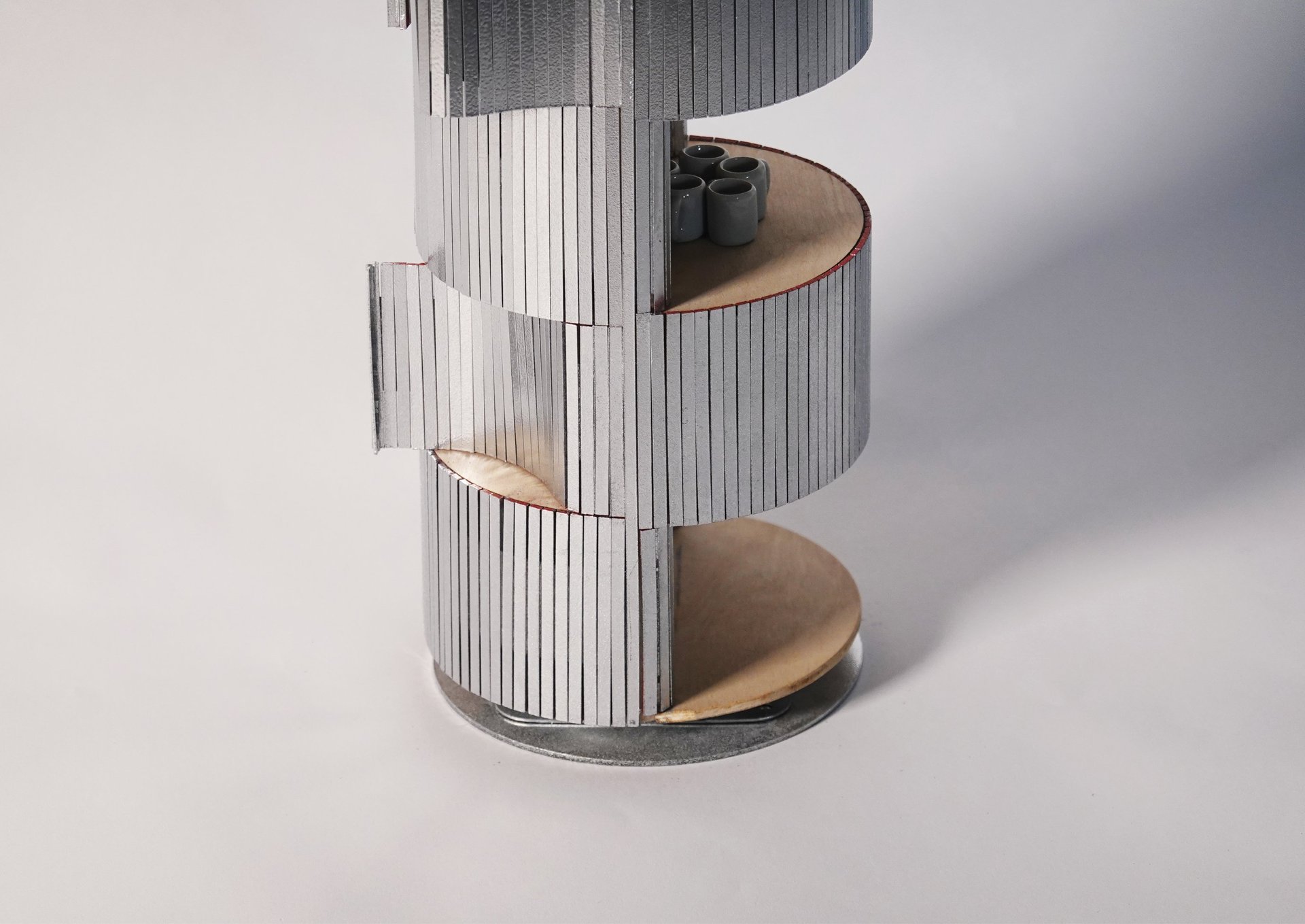 Metal tombour material is used as the skin to wrap around the wooden structure frame, providing flexibility on the hidden storage part. Making the cabinet enclosure into a playful landscape